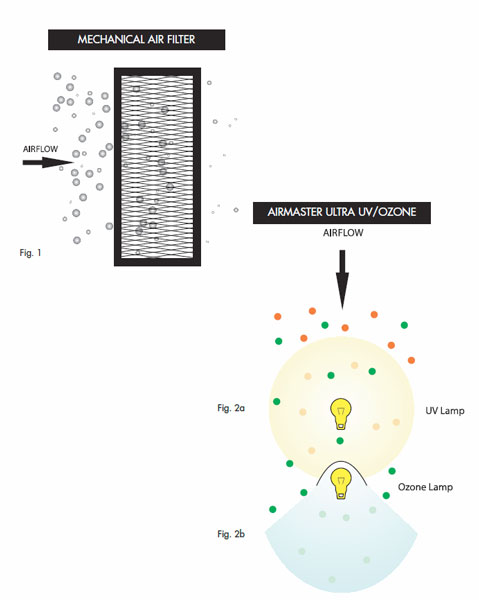 Air purifiers, on the other hand, actually sterilize or kill most contaminants. Both UV and ozone are purification methods. In the Airmaster Ultra, when air passes within the UV light zone (Fig. 2a), most airborne bacteria and molds are killed or sterilized. From there, the air passes by the ozone lamp (Fig. 2b) where odors are neutralized. The process happens continuously and silently as your heating/cooling system runs, and there are no messy filters to change.